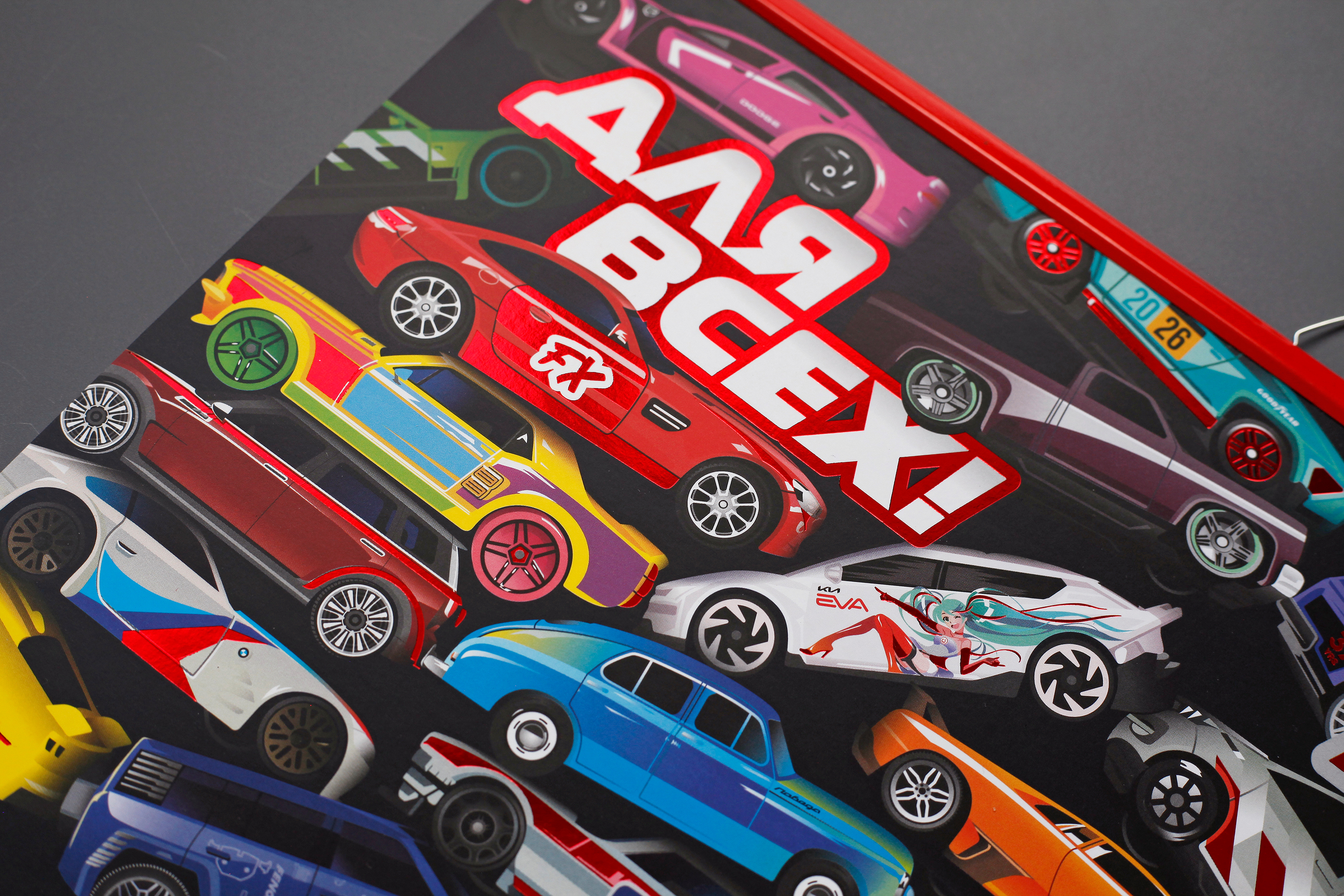 Каждый из объектов был вручную отчерчен и раскрашен в уникальном авторском стиле, а выборочное тиснение красной фольгой превратило это изделие в настоящий арт-объект.