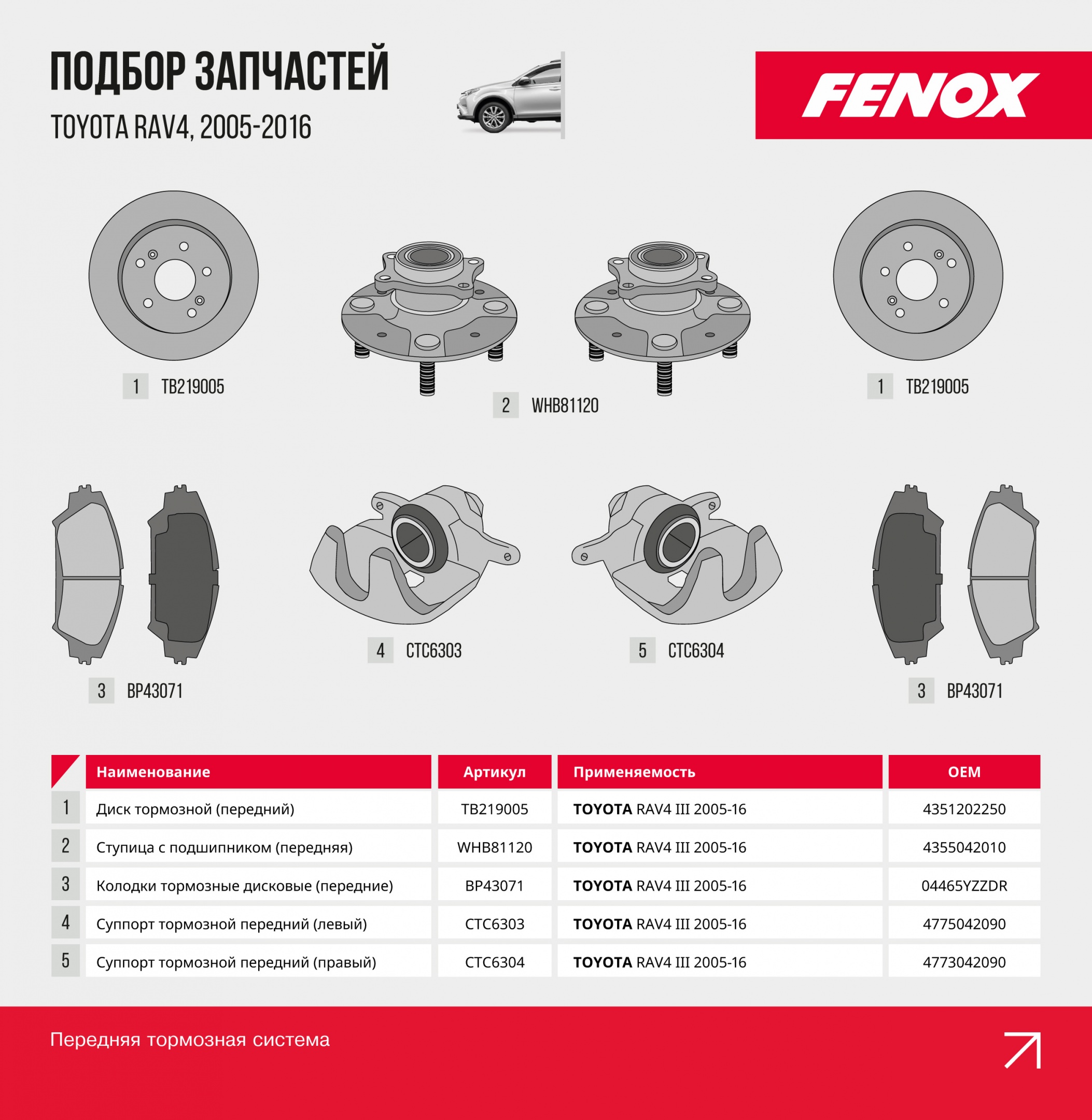 Даже надежный кроссовер требует качественных комплектующих. С запчастями FENOX вы получаете проверенное качество и совместимость с ключевыми узлами Toyota RAV4.