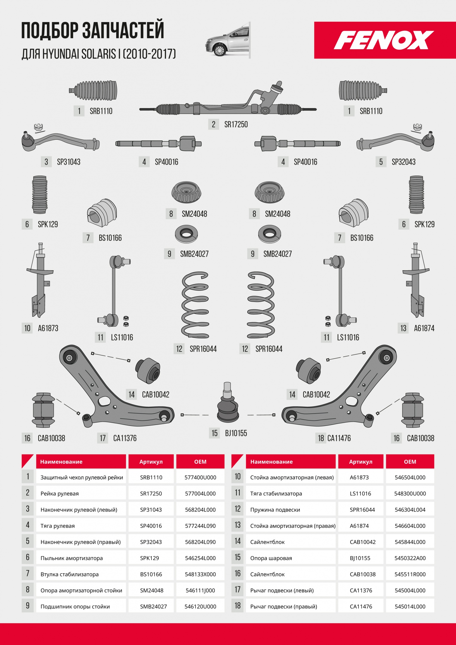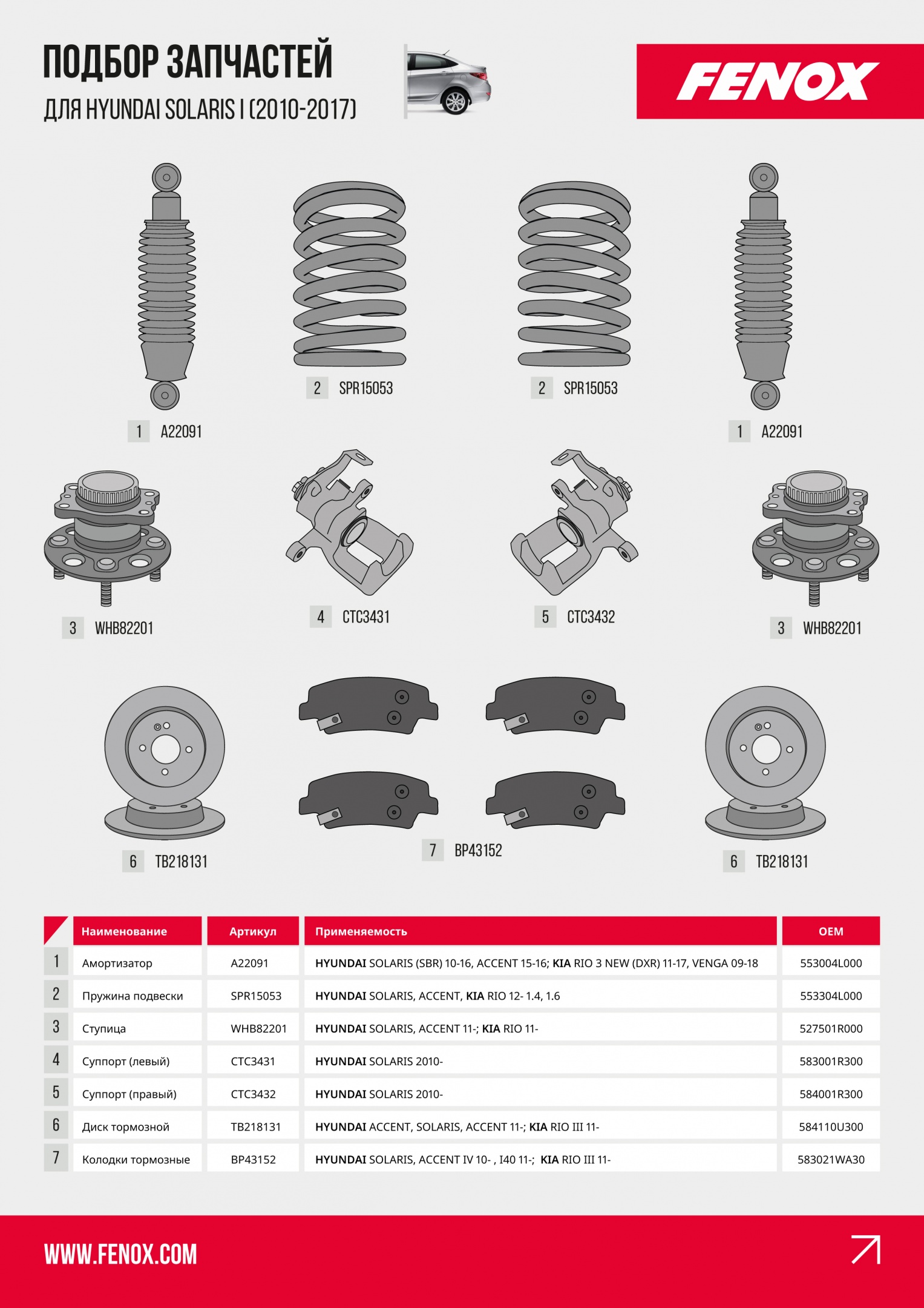 Hyundai Solaris ценится за надёжность, комфорт и современный дизайн, однако, как и любому другому автомобилю, ему требуется своевременное обслуживание и качественные комплектующие. Компания FENOX предлагает полный ассортимент деталей для подвески, рулевого управления и тормозной системы этого автомобиля.