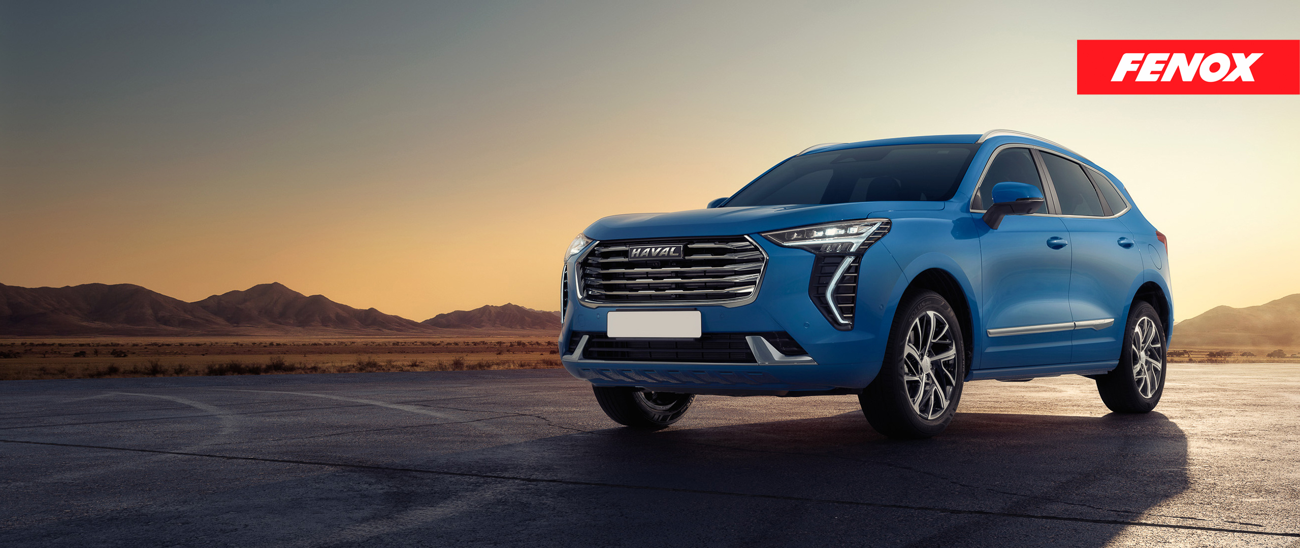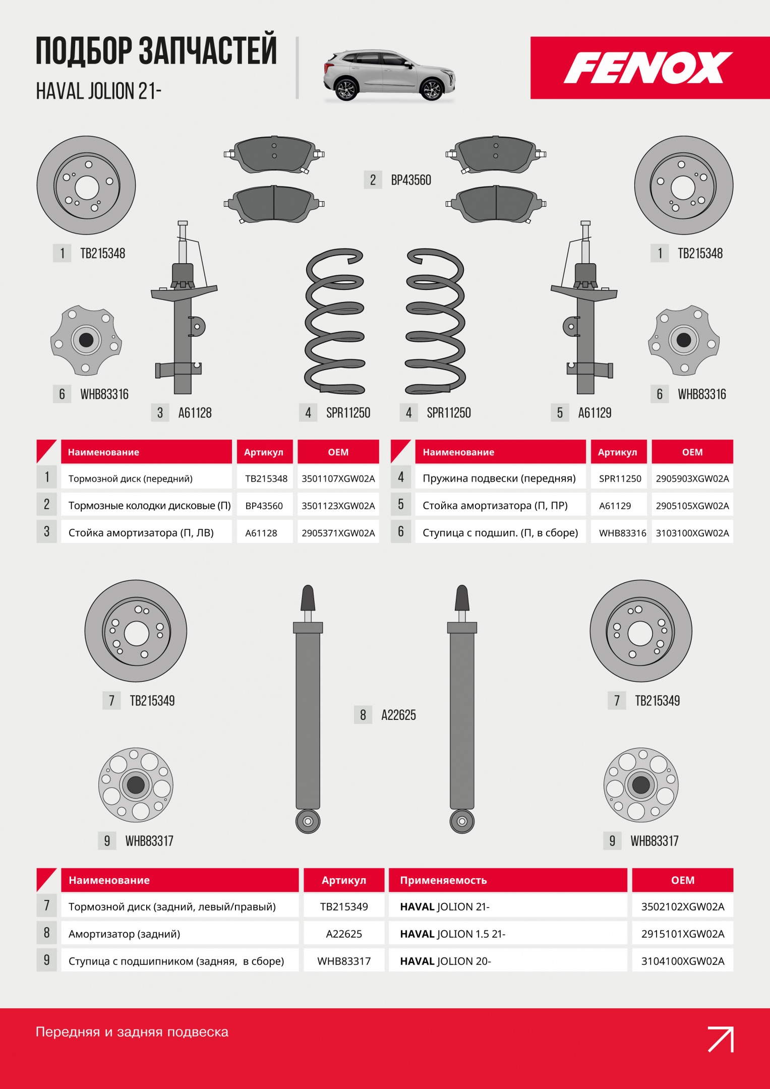 В подборке от FENOX представлены надёжные запасные части, обеспечивающие безопасность и комфорт при эксплуатации Haval Jolion. На схематичном изображении показаны ключевые элементы: тормозные диски, тормозные колодки дисковые, стойки амортизаторов, пружины подвески и ступицы с подшипником.