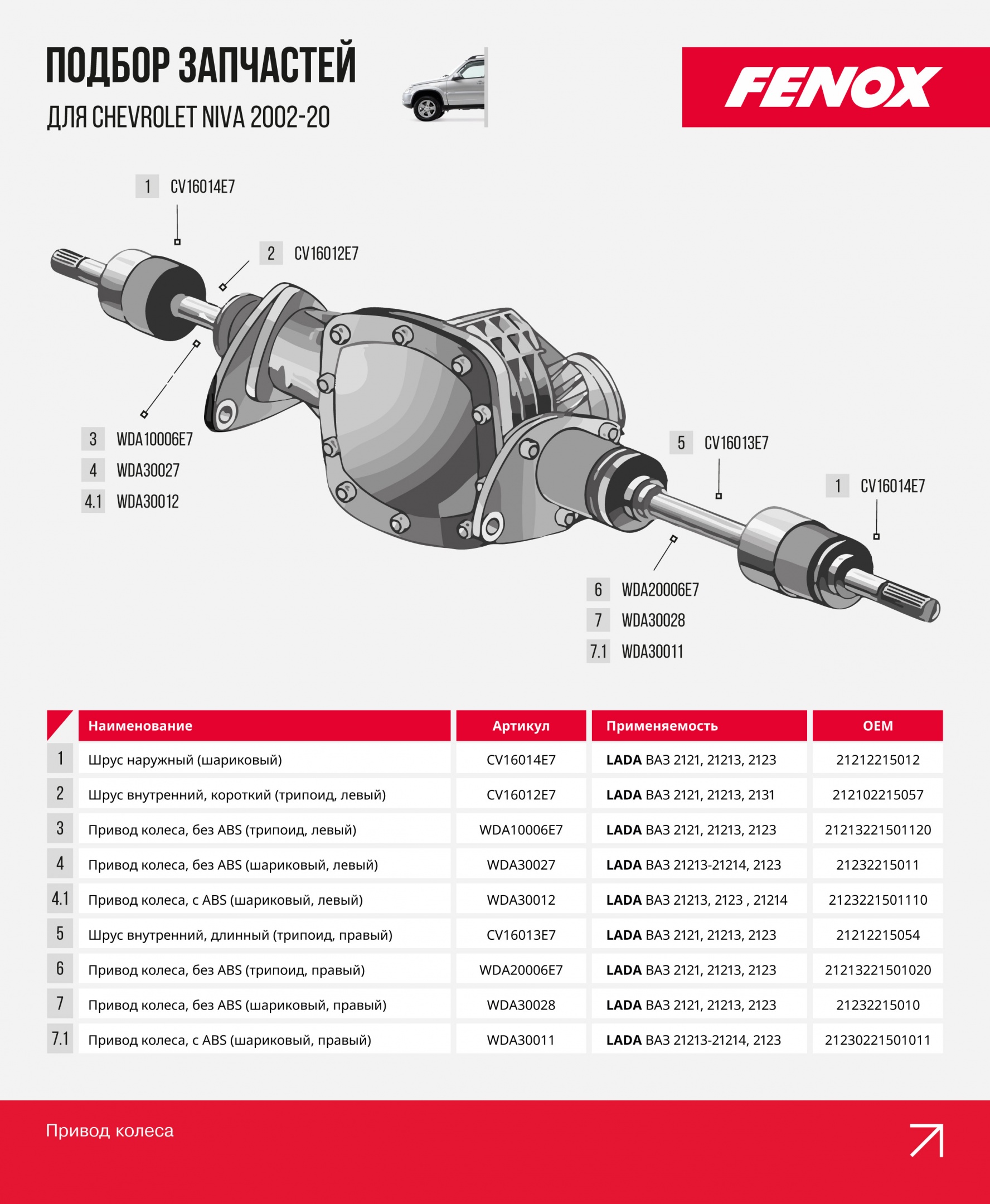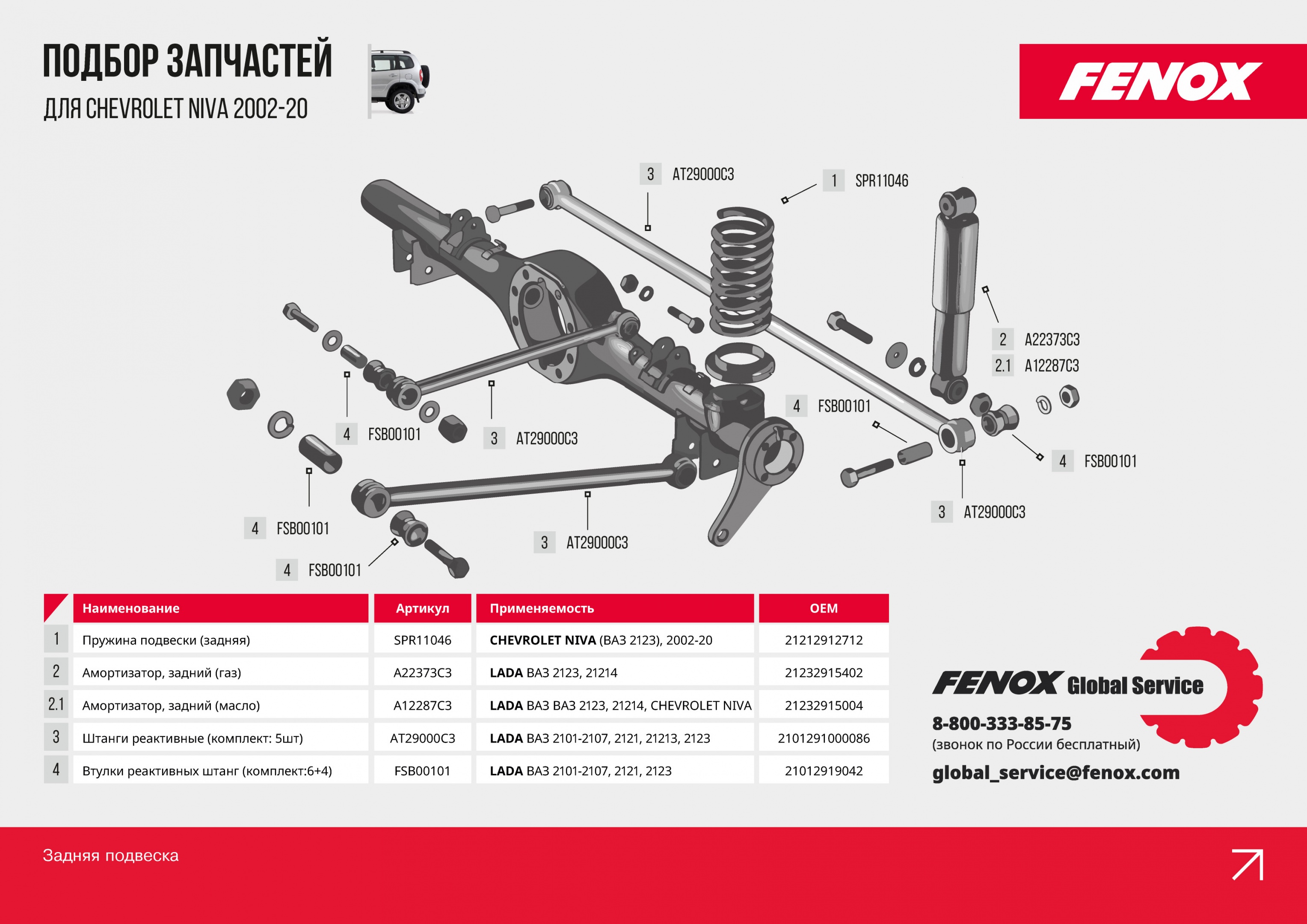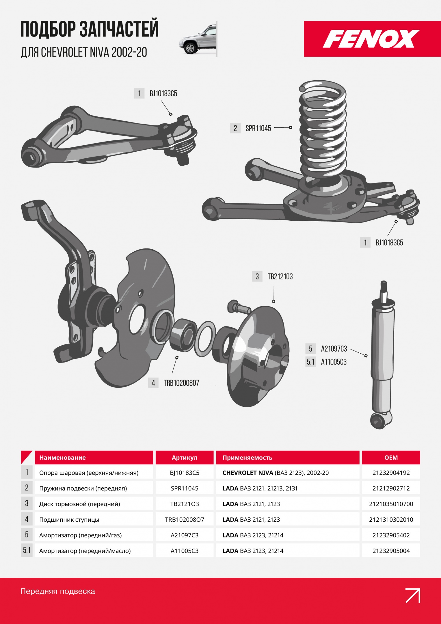 Продолжаем серию подборок запчастей для самых востребованных автомобилей. Chevrolet Niva, автомобиль, который уже много лет ценится за простоту конструкции, доступность обслуживания и уверенное поведение на бездорожье. Представляет собой второе поколение автомобилей повышенной проходимости и является развитием легендарной модели ВАЗ-2121 «Нива». Чтобы владельцам было проще ориентироваться в основных узлах, мы подготовили схемы и список ключевых деталей FENOX для обслуживания этой модели.