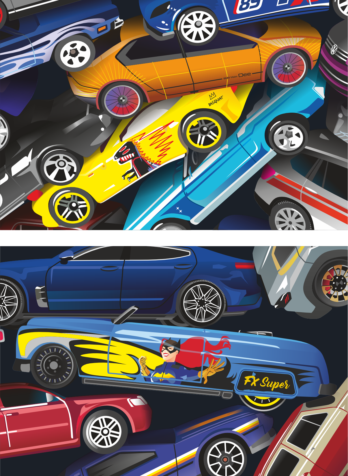 - Связь поколений: От классики Mercury Convertible 1949 (звезды фильма «Бунтарь без причины») с авторским принтом Batgirl до цифрового электрокара будущего BMW i Vision Dee, предвосхищающего технологии 2026 года.