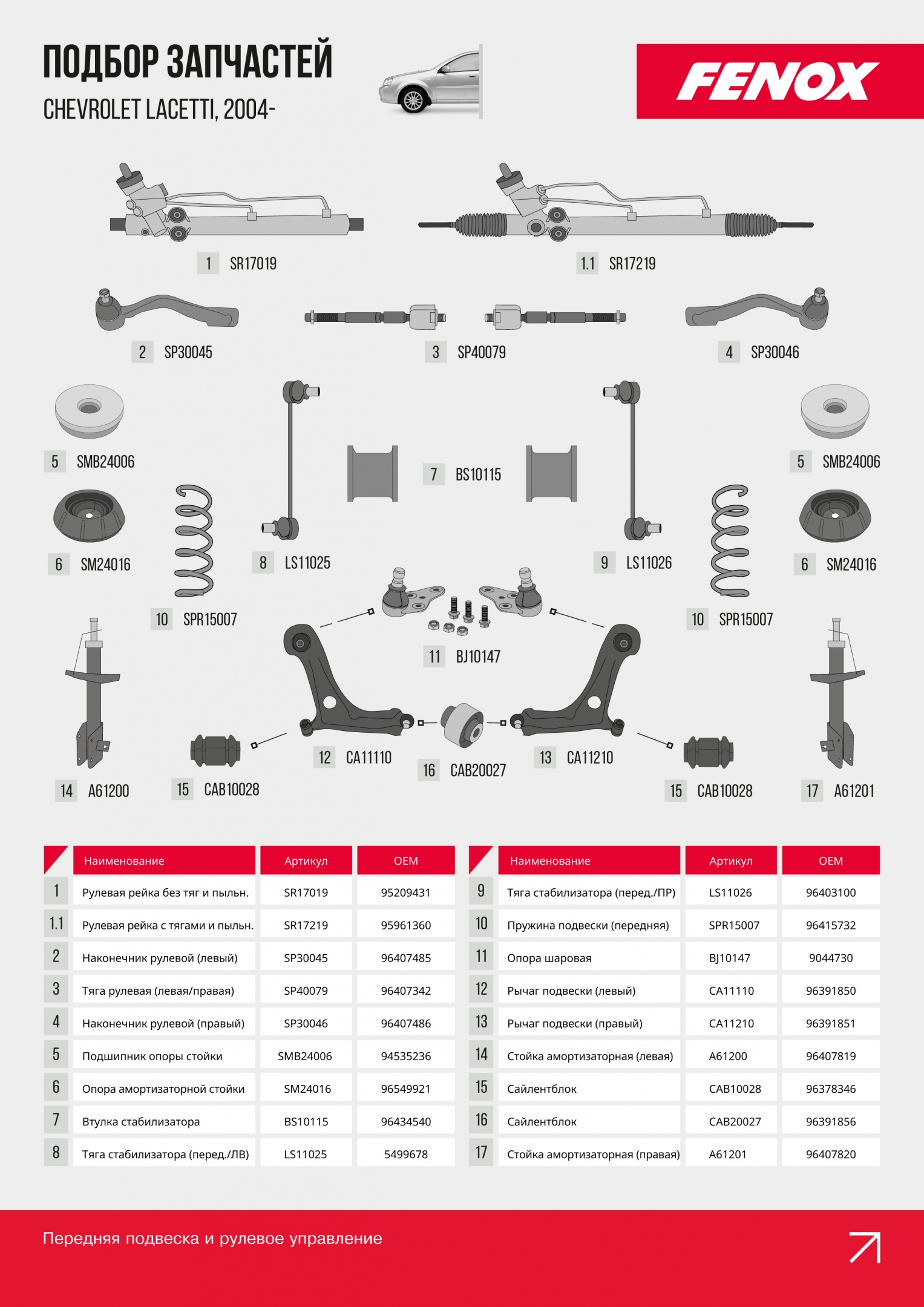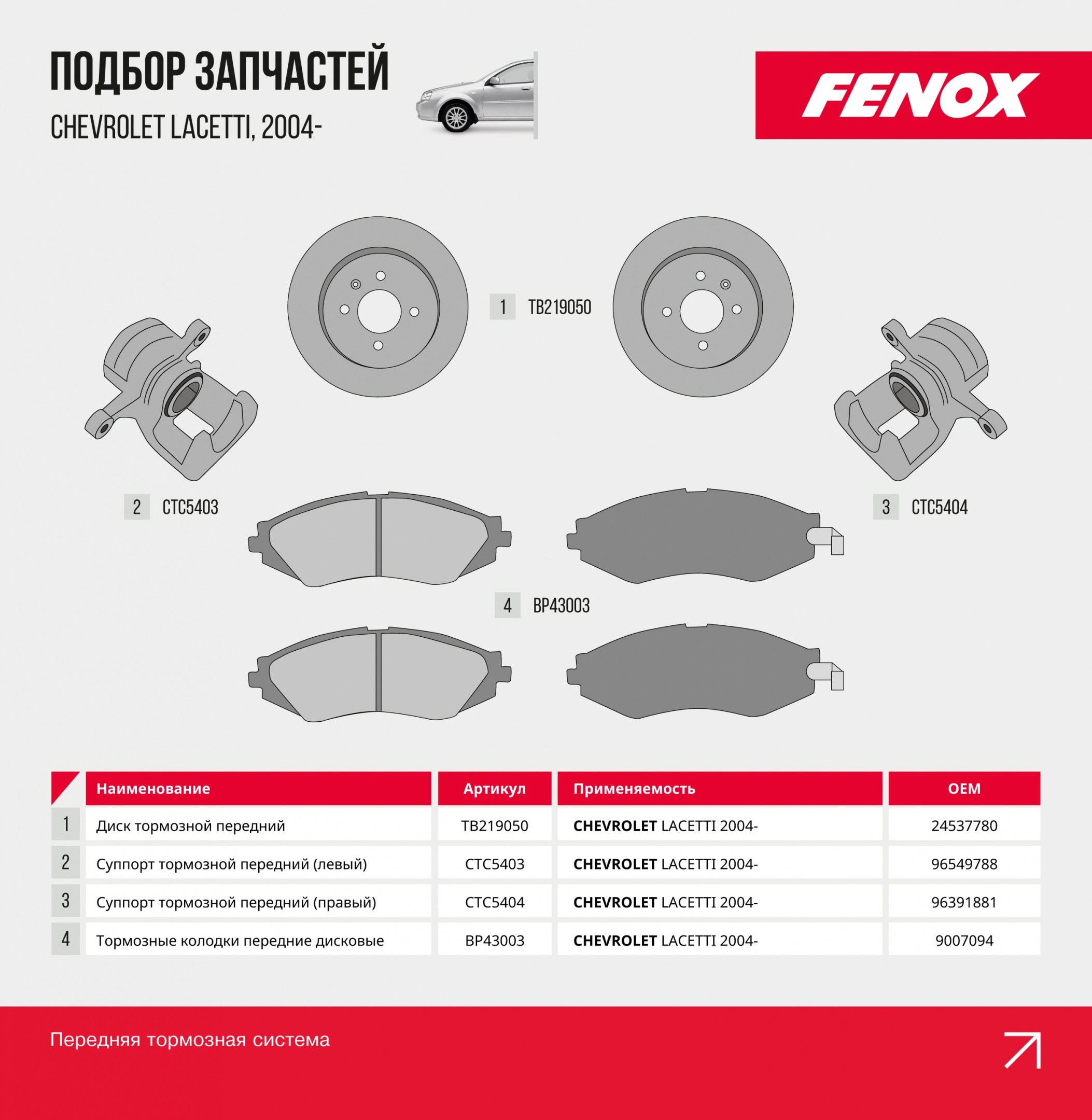 Даже надежный Lacetti требует качественных деталей для стабильной работы и безопасности. С запчастями FENOX вы получаете проверенное качество и совместимость с ключевыми узлами автомобиля.