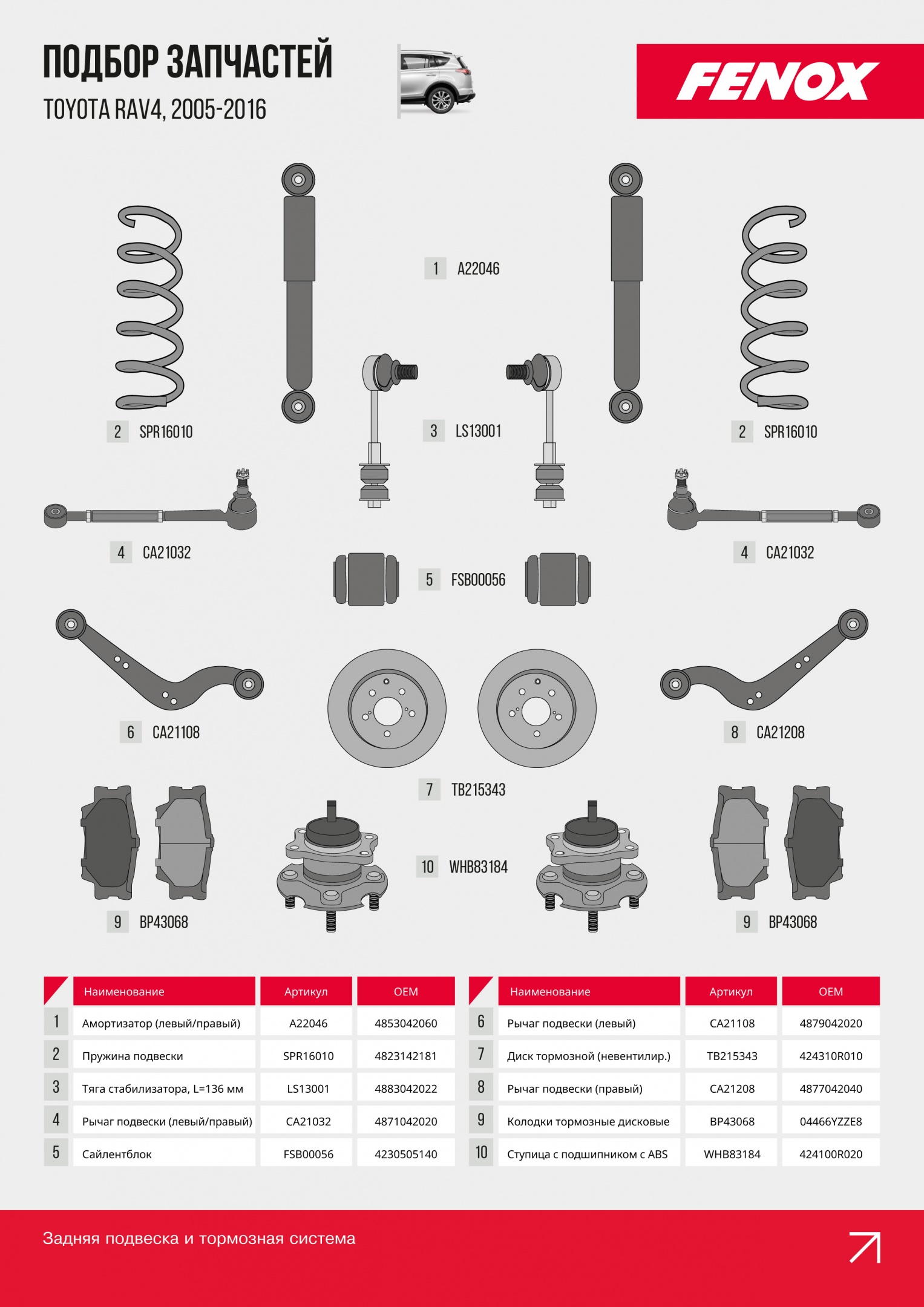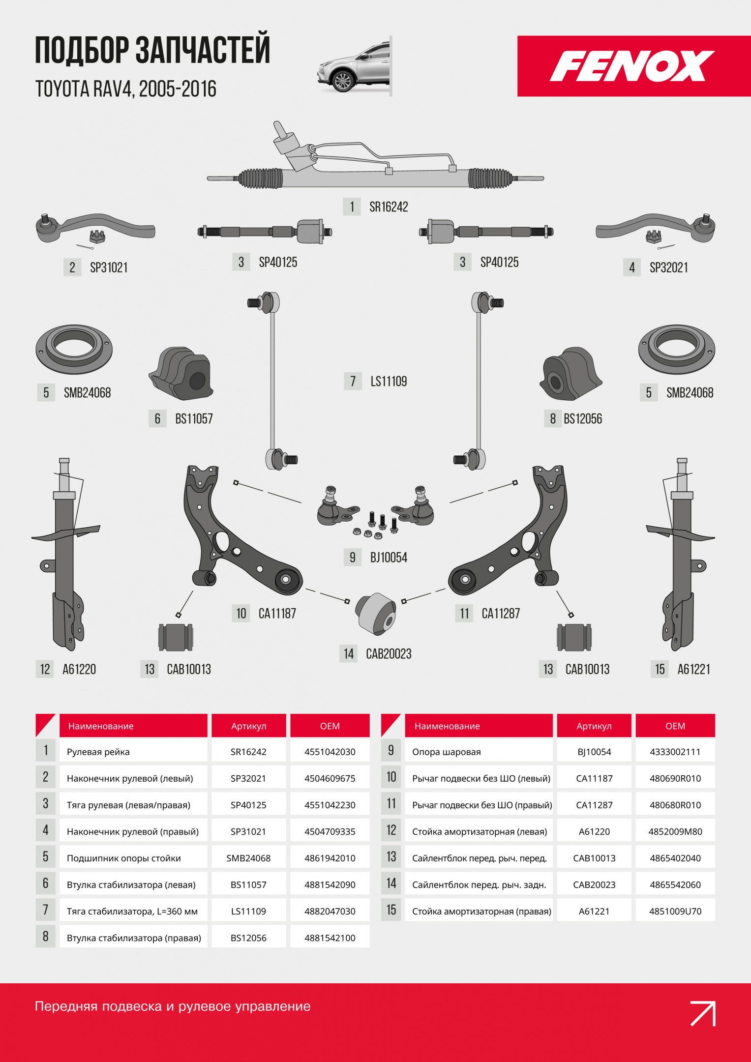 Даже надежный кроссовер требует качественных комплектующих. С запчастями FENOX вы получаете проверенное качество и совместимость с ключевыми узлами Toyota RAV4.
