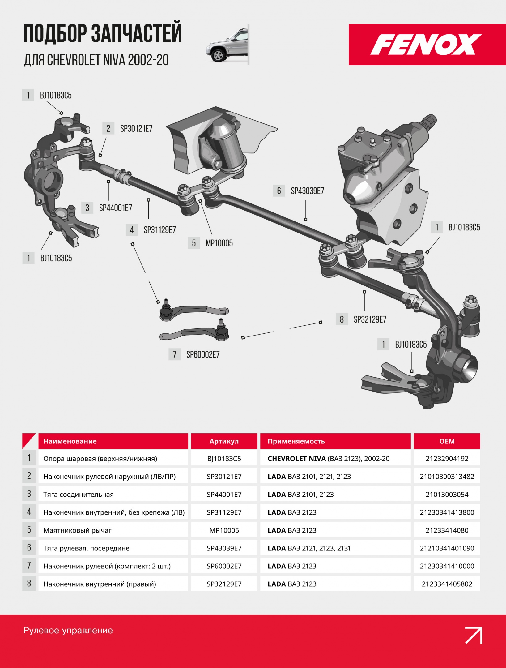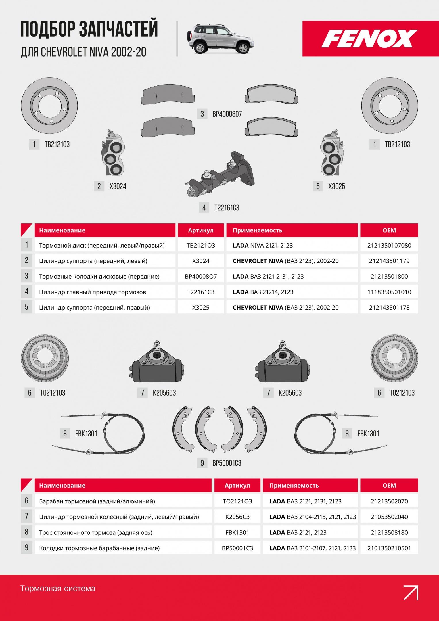 Продолжаем серию подборок запчастей для самых востребованных автомобилей. Chevrolet Niva, автомобиль, который уже много лет ценится за простоту конструкции, доступность обслуживания и уверенное поведение на бездорожье. Представляет собой второе поколение автомобилей повышенной проходимости и является развитием легендарной модели ВАЗ-2121 «Нива». Чтобы владельцам было проще ориентироваться в основных узлах, мы подготовили схемы и список ключевых деталей FENOX для обслуживания этой модели.