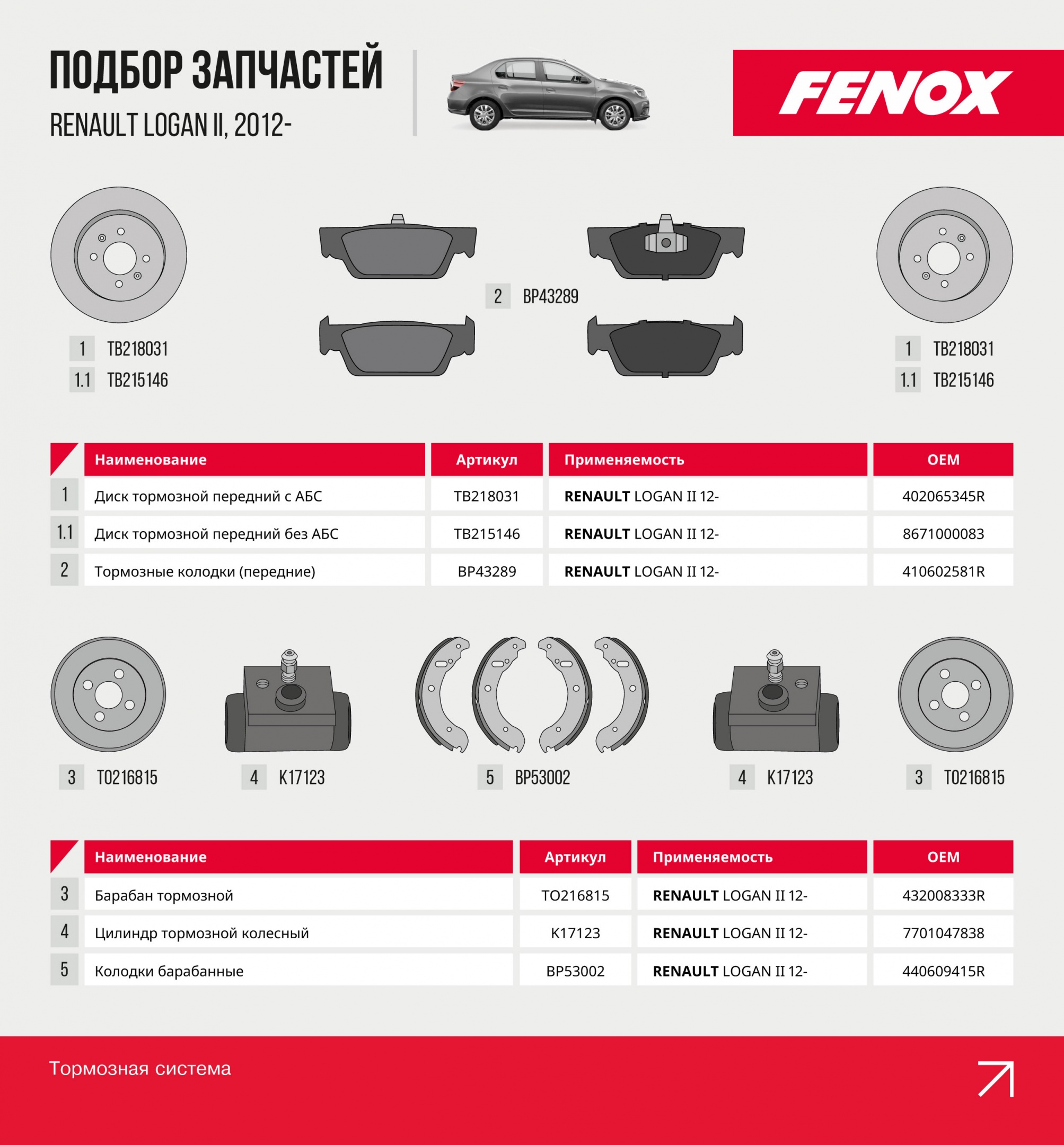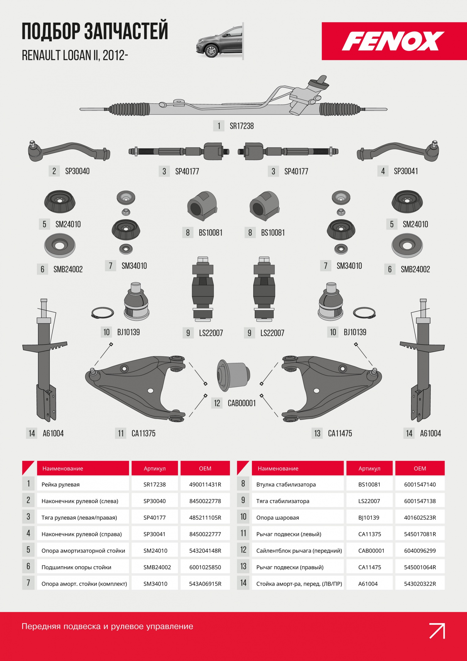 Второе поколение Logan получило обновленную конструкцию, эргономичную подвеску MacPherson и газовую амортизаторную стойку, способную обеспечить улучшенную управляемость и комфорт, при этом осталось максимально простым и удобным в обслуживании. Чтобы упростить подбор запчастей, мы подготовили наглядные схемы основных узлов и список наиболее востребованных позиций FENOX.